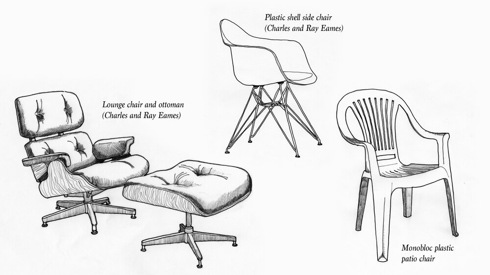 American designers Charles and Ray Eames, a husband and wife team, were best known for their luxurious Eames Lounge Chair (left). Rybczynski says the ubiquitous plastic patio chair (right) is a direct “descendant” of Eames designs.